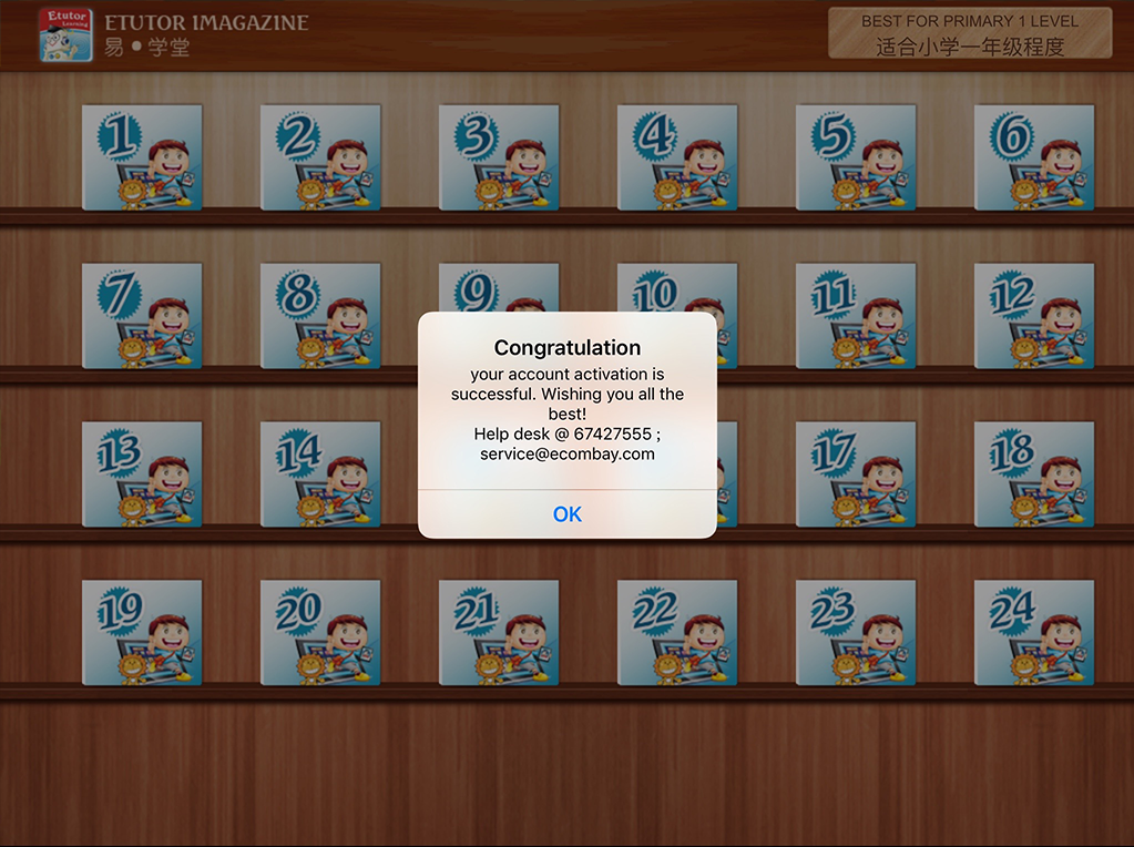 Pop-up Window will show “Congratulation” upon successful registration. Tap on the bookshelf to select iClass iPad Version content.